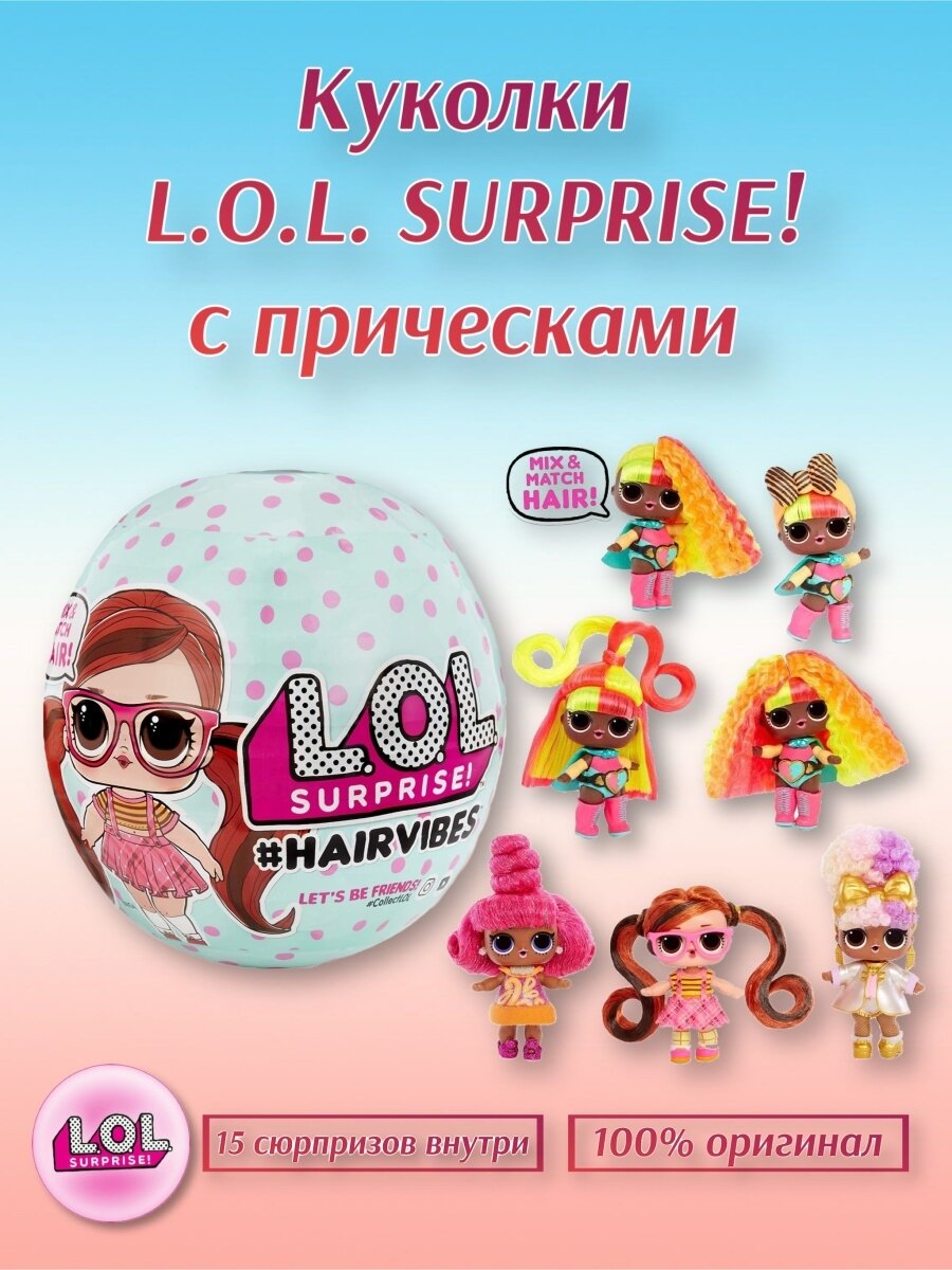 Набор LoL Hairvibes выполнен в виде круглого шара, внутри которого, помимо самой куколки есть 15 сюрпризов, в том числе комплекты одежды и обуви для куколки, аксессуары для волос, бутылочка и расческа. Также прилагаются по 4 детали парика и 3 настоящих парика с волосами, которые можно менять в любой момент и придумывать невероятные прически.