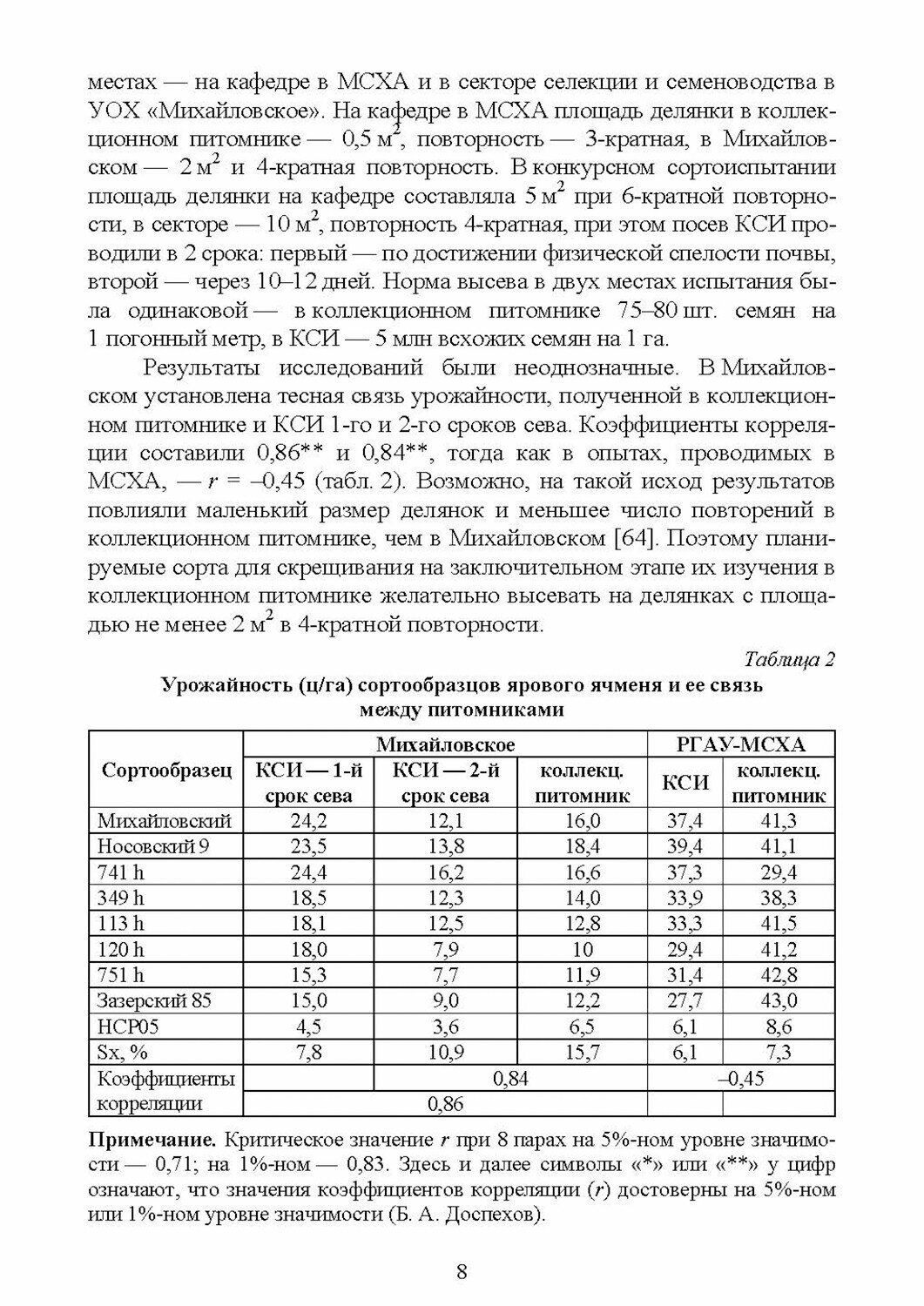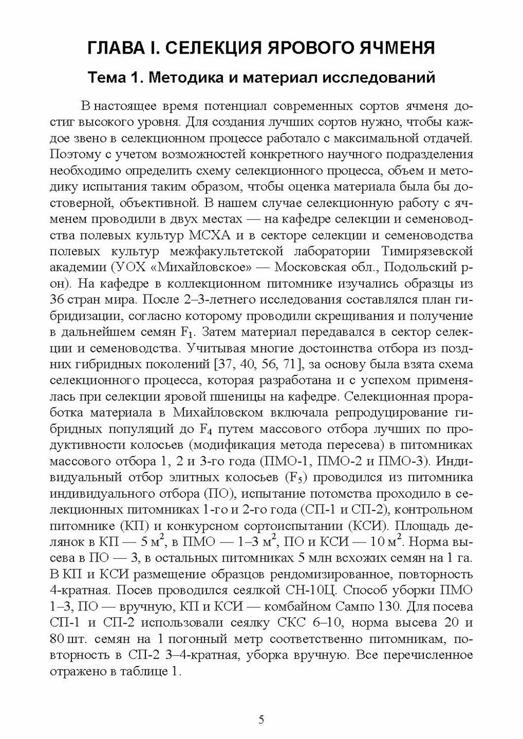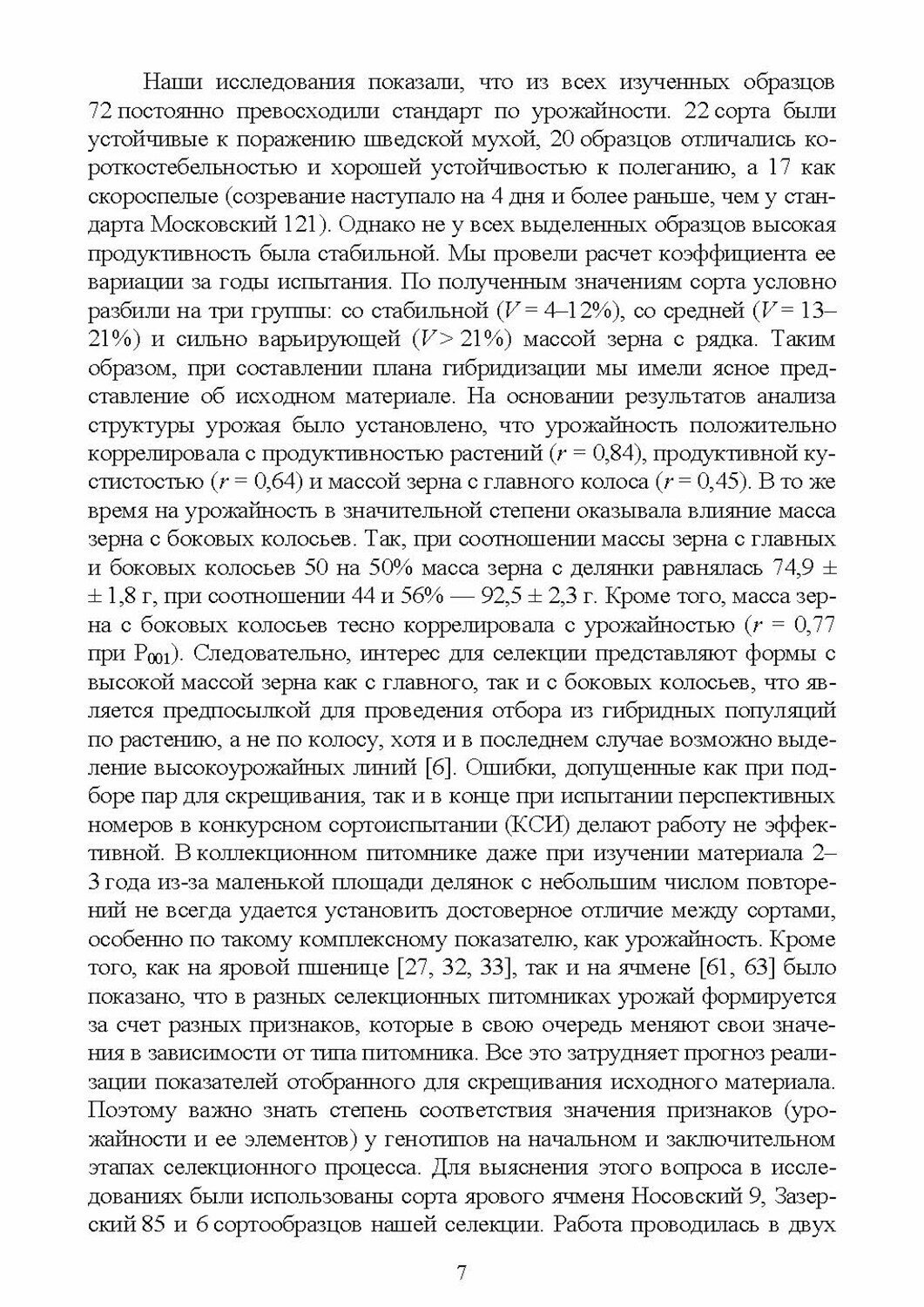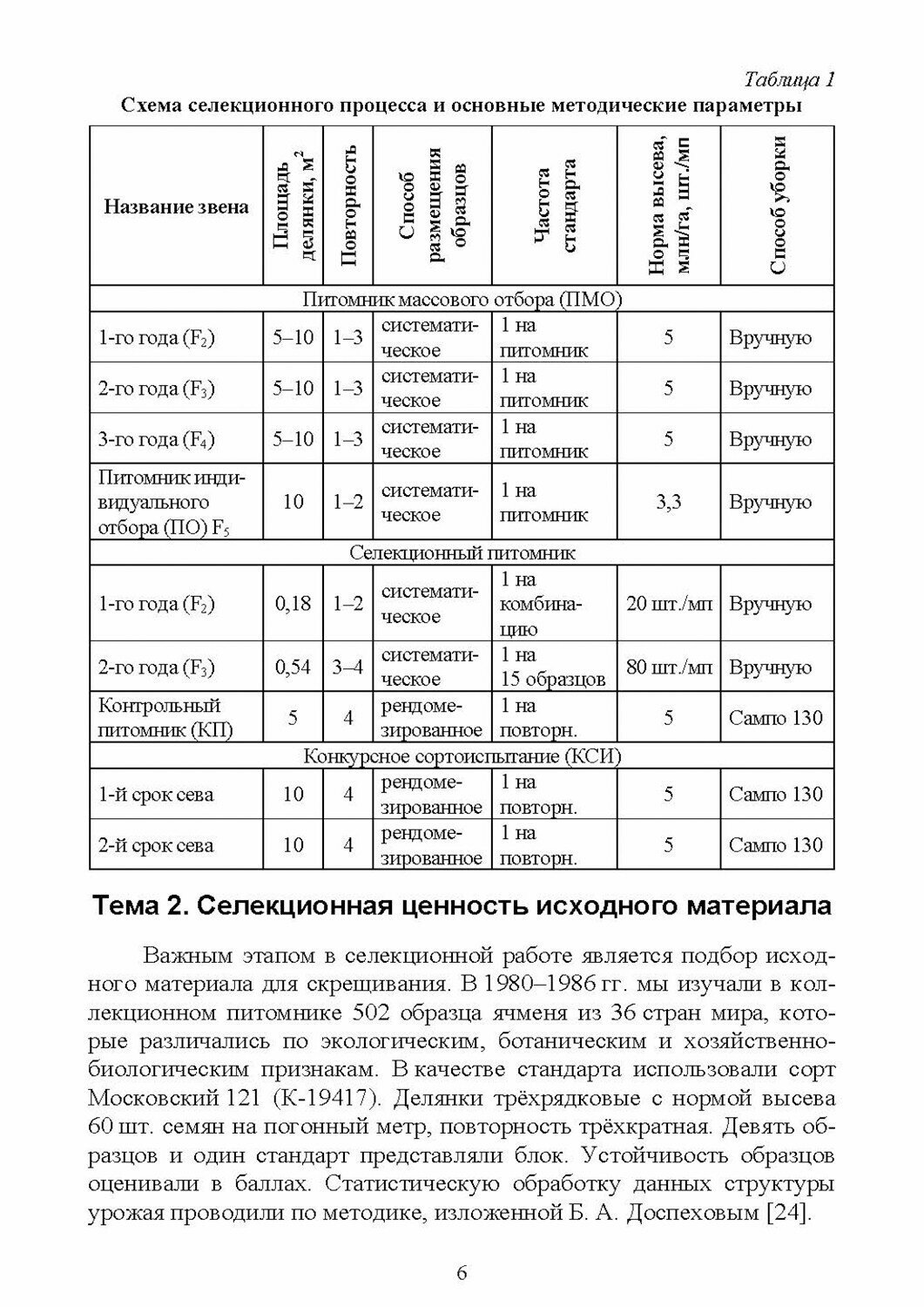 Селекционная работа по ячменю проводилась в течение 35 лет на кафедре селекции и семеноводства полевых культур РГАУ - МСХА имени К. А. Тимирязева по обычной схеме для самоопылителей. Однако, в каждом звене селекционного цикла дополнительно велась научно-исследовательская работа, направленная на повышение точности опыта, надежности оценок, эффективности селекционного процесса. Это касается оценки исходного материала, прогнозирования селекционной ценности гибридных популяций ячменя, надежности оценки линий в зависимости от способа отбора и испытания. Изучалось соответствие оценок хозяйственно-биологических показателей в разных звеньях селекционного процесса. Особое внимание уделено оценке сортов ячменя в конкурсном сортоиспытании с использованием специальных приемов. Установлены показатели, по которым можно за 50 дней до уборки дать прогноз урожайности. Показана эффективность визуальной оценки линий ярового ячменя по урожайности на разных этапах селекционной работы. Отмечены основные результаты - создание трех сортов.