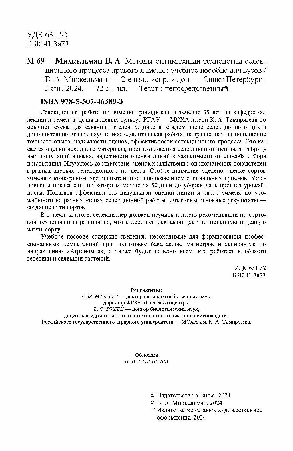 Методы оптимизации технологии селекционного процесса ярового ячменя. Учебное пособие (В. А. Михкельман); Издательство ЛАНЬ, 2020