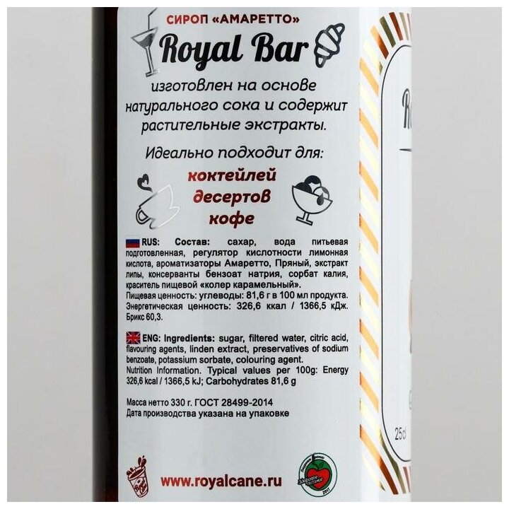 Сироп Амаретто удлбного объема 250 мл. торговой марки Royal Cane изготовлен из качественных ингредиентов, которые специалисты компании тщательно отбирают у проверенных и надежных поставщиков, строго на основе требований СанПин 2.3.2.1078-01 п. п. 1.8.5.6. и выпускается по ГОСТ 28499-2014. В процессе производства не используются заменители сахара, подсластители, искусственные пищевые красители и консерванты, усилители вкуса и ГМО-продуты, что свидетельствует о безопасности сиропа. Сироп со вкусом Амаретто имеет вкус миндаля, ванили и пряностей! Широко применяется в качестве ингредиента как профессионалами в ресторанах, кофейнях и барах, так и в домашних условиях для приготовления коктейлей, латте, капучино, чая и милкшейков. Помимо этого, сироп со вкусом Амаретто добавляют в алкогольные коктейли на основе водки, джина, виски и рома. Сироп отлично сочетается с мороженым, блинчиками и вафлям, муссам, а также с выпечкой и другим сладким напиткам и блюдам. Купив сироп Амаретто торговой марки Royal Cane, Вы можете сделать прекрасный подарок как себе так и своим родным и друзьям, которые являются ценителями кофе или любителями коктейльных вечеринок и домашней кулинарии.Компания Royal Cane является одним из лидеров российского рынка производителей сиропов, топпингов и фруктовых пюре для напитков и кулинарии. В ассортиментном портфеле компании более 200 разнообразных продуктов на основе натуральных концентрированных соков, ягод и фруктов шоковой заморозки. Взыскательный потребитель может попробовать как классические вкусы (карамель, шоколад, лесной орех и другие), так и экзотические ( белый шоколад, личи, зеленая дыня, жасмин, красный апельсин, калина, лаванда, лемонграсс, маракуйя).