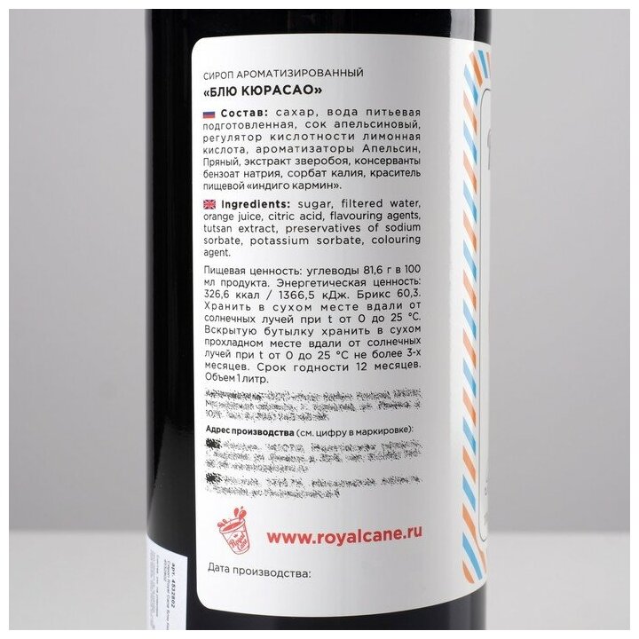 Сироп Блю-Кюрасао торговой марки Royal Cane изготовлен из качественных ингредиентов, которые специалисты компании тщательно отбирают у проверенных и надежных поставщиков, строго на основе требований СанПин 2.3.2.1078-01 п. п. 1.8.5.6. и выпускается по ГОСТ 28499-2014. В процессе производства не используются заменители сахара, подсластители, искусственные пищевые красители и консерванты, усилители вкуса и ГМО-продуты, что свидетельствует о безопасности сиропа. Сироп Голубой Кюрасао имеет выраженный аромат вяленого мандарина и освежающий цитрусовый вкус с горчинкой. Широко применяется в качестве ингредиента как профессионалами в ресторанах, кофейнях и барах, так и в домашних условиях для приготовления коктейлей, освежающих лимонадов. Сироп со вкусом Блю-Кюрасао добавляют в алкогольные коктейли на основе водки, джина, виски и рома. Купив сироп Блю Кюрасао торговой марки Royal Cane Вы можете сделать прекрасный подарок как себе так и своим родным и друзьям, которые являются любителями коктейльных вечеринок.Компания Royal Cane является одним из лидеров российского рынка производителей сиропов, топпингов и фруктовых пюре для напитков и кулинарии. В ассортиментном портфеле компании более 200 разнообразных продуктов на основе натуральных концентрированных соков, ягод и фруктов шоковой заморозки. Взыскательный потребитель может попробовать как классические вкусы (карамель, мята, шоколад, лесной орех и другие), так и экзотические ( белый шоколад, личи, зеленая дыня, жасмин, красный апельсин, калина, лаванда, лемонграсс, маракуйя). *Внимание! Сироп не сочетается с кофе, делая его темно-серым и не очень приятным на вкус.