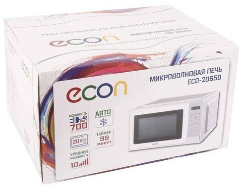 Микроволновая печь Econ – универсальный помощник для разогрева и разморозки! Удобное сенсорное управление позволит вам с легкостью пользоваться этой микроволновой печью. На дисплее отображаются настройки. Функция быстрой разморозки позволяет разморозить продукты, сохранив их свежесть и текстуру. За быстрый результат отвечает высокая мощность. Внутренний объем составляет 20 л. Функция Таймера позволит запрограммировать работу прибора на определенное время.