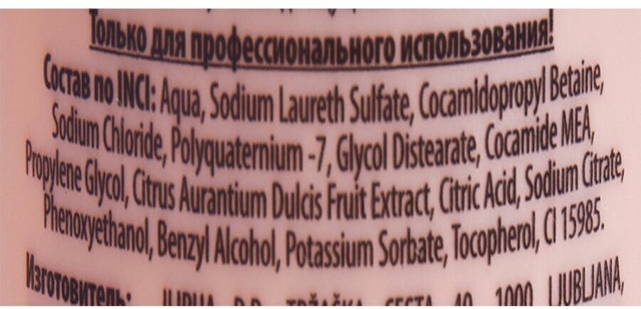 Состав: aqua, sodium laureth sulfate, cocamidopropyl betaine, sodium chloride, polyquaternium -7, glycol distearate, cocamide mea, propylene glycol, citrus aurantium dulcis fruit extract, citric acid, sodium citrate, phenoxyethanol, benzyl alcohol, potassium sorbate, tocopherol, ci 15985
