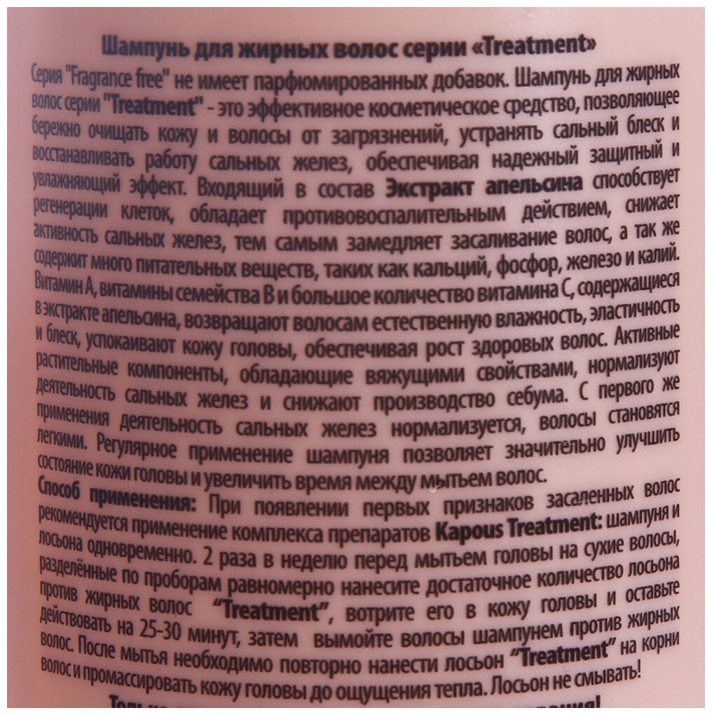 | Применение | при появлении первых признаков засаленных волос рекомендуется применение комплекса препаратов Kapous Treatment:шампуня и лосьона одновременно. 1) 2 раза в неделю перед мытьем головы на сухие волосы, разделённые по проборам равномерно нанесите достаточное количество лосьона против жирных волос Treatment, вотрите его в кожу головы и оставьте действовать на 25-30 минут. 2) вымойте волосы шампунем против жирных волос. 3) После мытья необходимо повторно нанести лосьон “Treatment” на корни волос и пр |