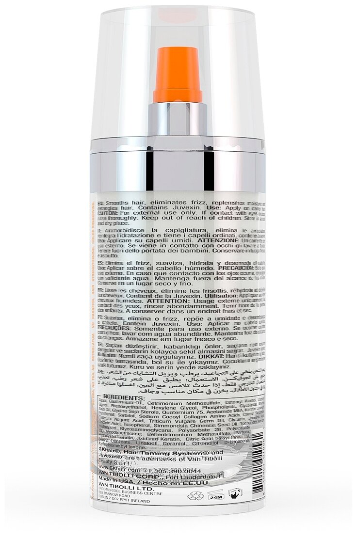 Состав: вода, каприлил гликоль, гексилен гликоль, парфюм, полисорбат-20, цетиариловый спирт, кватерниум-91, ацетимад МЕА, амодиметикон, цетримониум метосульфат, гидролизованный кератин (джувексин), пантенол, глицерин, бегентримониум метисульфат, масло пшеницы, кокоил саркоцин, масло жожоба, натрий кокоил коллаген аминокислота, сорбитол, лимонная кислота, тридецет-12, линолиновая кислота, токоферол ацетат, токоферол, гидролизованный глюкосаминогликант, полисорбат-80, линолиевая кислота, феноксиэтанол, окисленный кератин, гераниол, цетримониум хлорид, бутилфенил метилпропионал, гексил циннамал, бензил бензоат, цитронелол, лимонен