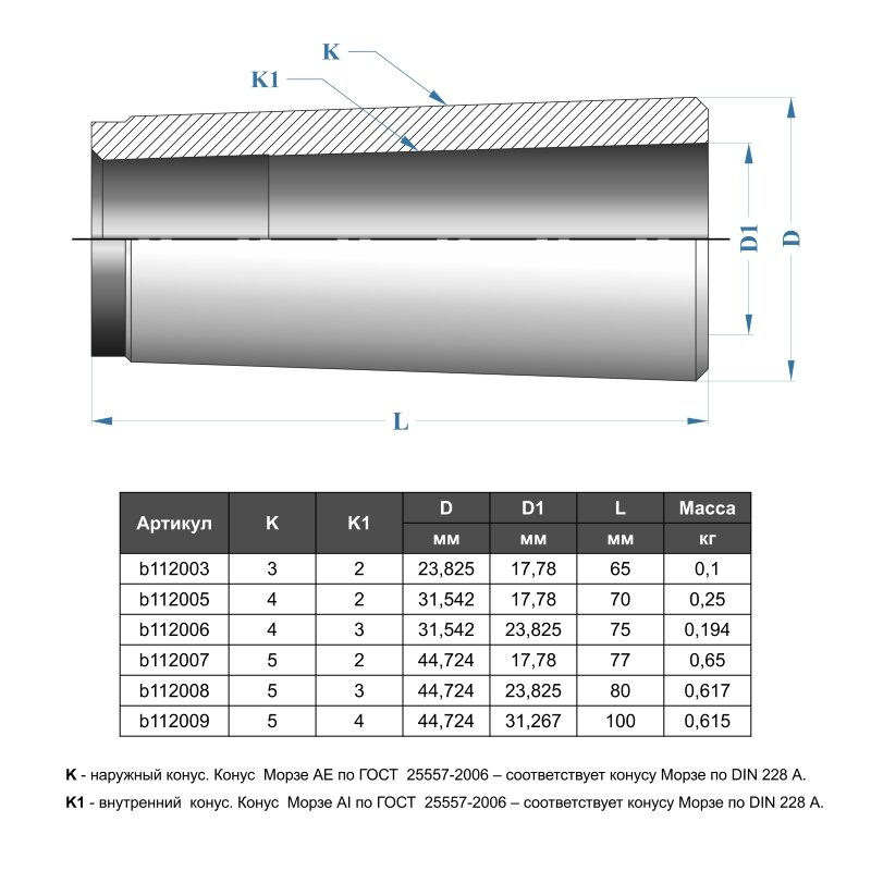 • Используются для установки инструмента с коническим хвостовиком в станочный шпиндель, если конус инструмента не совпадает с конусом шпинделя. • Основное применение – для крепления концевых и шпоночных фрез с коническим хвостовиком на фрезерных станках без ЧПУ.• Материал – сталь 40Х по ГОСТ 4543-71.• Наружный конус – конус Морзе AE по ГОСТ 25557-2006 – соответствует конусу Морзе по DIN 228 форма A.• Внутренний конус – конус Морзе AI по ГОСТ 25557-2006 – соответствует конусу Морзе по DIN 228 форма A.