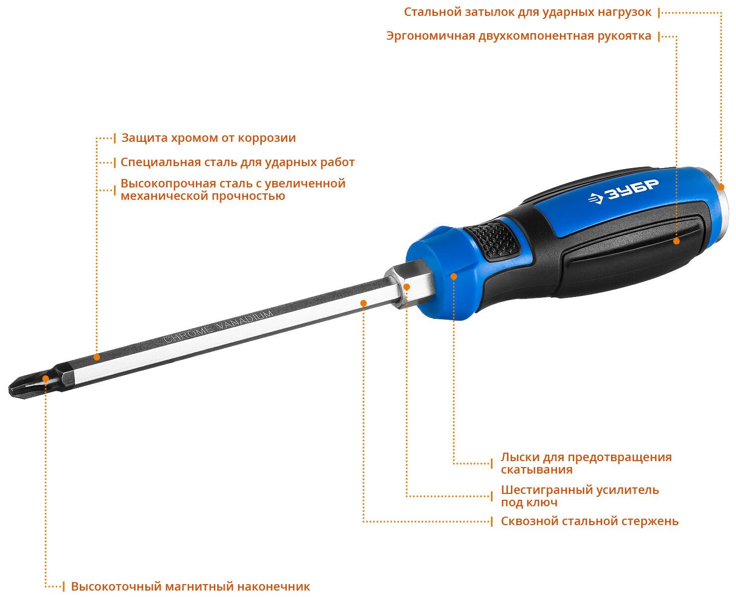 | Прочие особенности и свойства | Отвертки «ЗУБР» разработаны в соответствии с высокими требованиями профессионалов. Выдерживают высокие нагрузки благодаря высококачественной хромованадиевой стали, закаленной по особой технологии. Имеют большой ресурс, обеспечивают высокое качество выполнения работ при монтаже и демонтаже резьбовых соединений,,Сквозной хромомолибденовый шестигранный стержень с усилителем под ключ,,Специальная закалка по особой технологии |