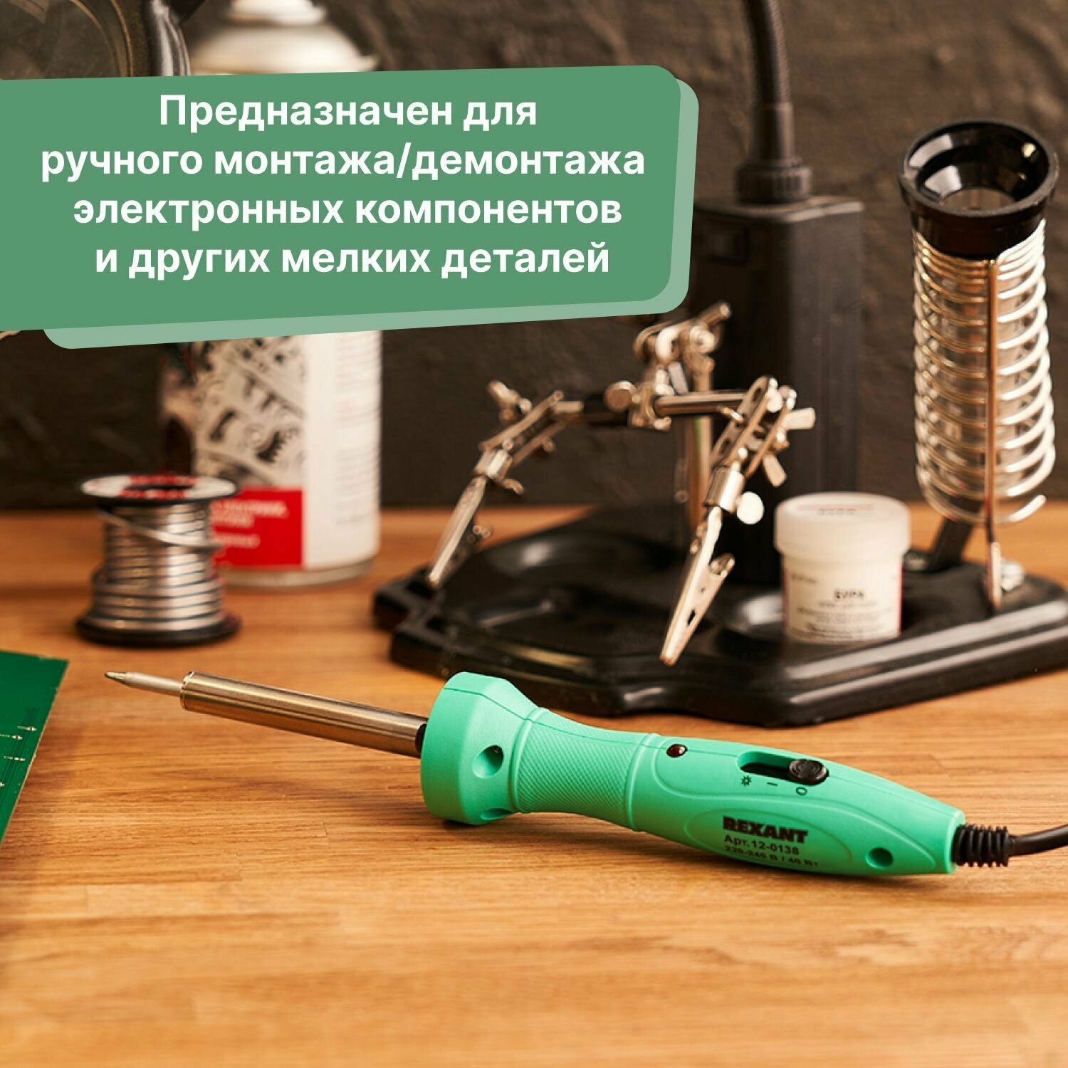 Паяльник с долговечным жалом и LED подсветкой мощностью предназначен для ручного монтажа/демонтажа электронных компонентов и других мелких деталей.