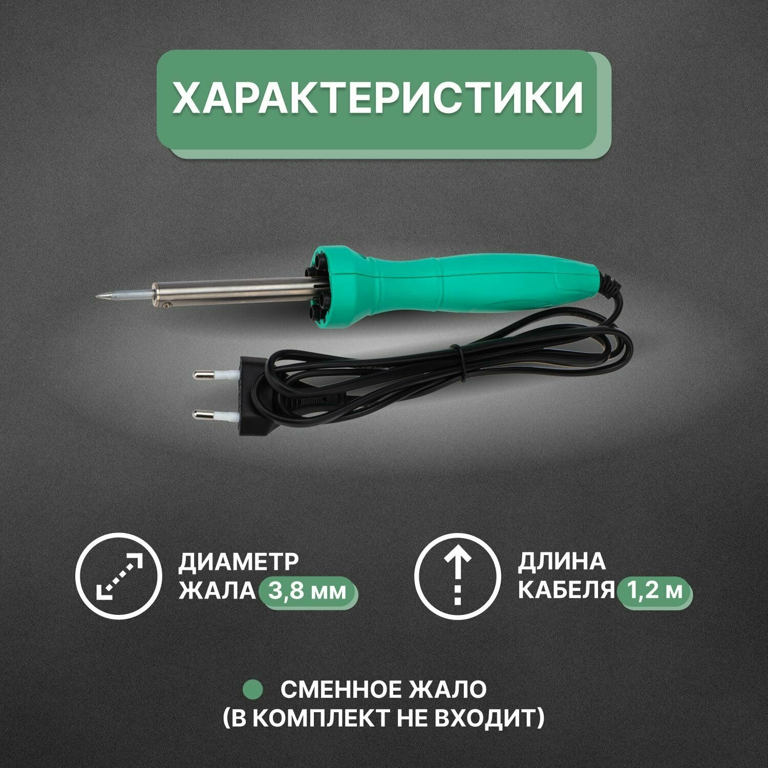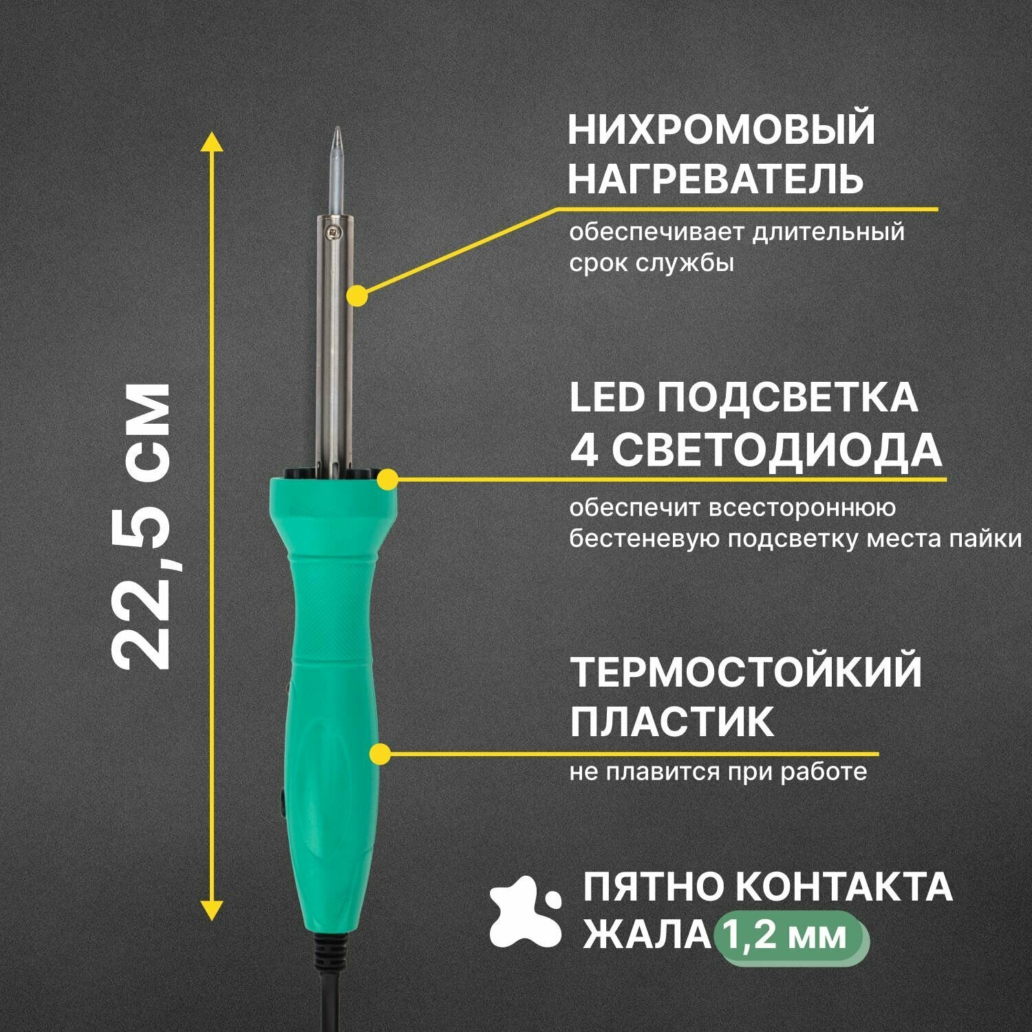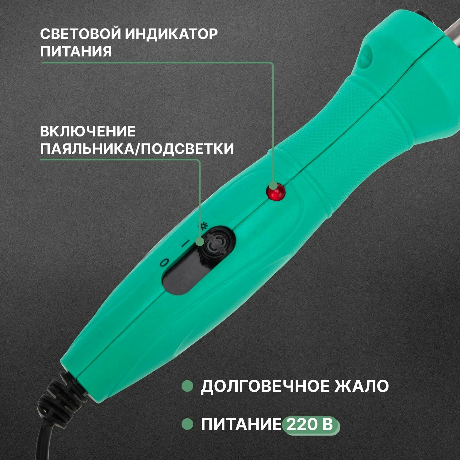 Главное преимущество: LED подсветка, состоящая из 4-х светодиодов, находящихся в нижней части рукоятки. Подсветка обеспечит всестороннюю бестеневую подсветку места пайки. Долговечное жало паяльника состоит из медьсодержащего сердечника, покрытого слоем электролитически осажденного железа, отличающегося высокой стойкостью к коррозии. При соблюдении ряда предосторожностей жало способно работать длительное время без утраты эксплуатационных свойств. В случае необходимости его можно легко и быстро заменить (сменное жало в комплект не входит).
