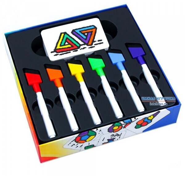Комплектация: 55 карт с картинками, 5 двусторонних карт для подсчёта очков, 6 маркеров со стирающими колпачками, сумочка-игровое поле.
