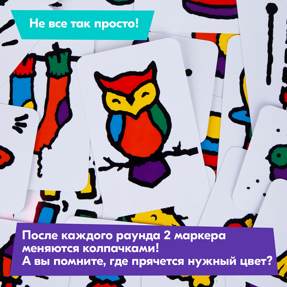 Вдохните жизнь в чёрно-белые картинки! Бросьте взгляд на цветную версию, переверните карту и постарайтесь раскрасить её точно так же и быстрее всех! Чем лучше вы справитесь, тем больше очков получите, но не дайте коварным маркерам сбить вас с толку, ведь в каждом раунде колпачки на них меняются местами!
