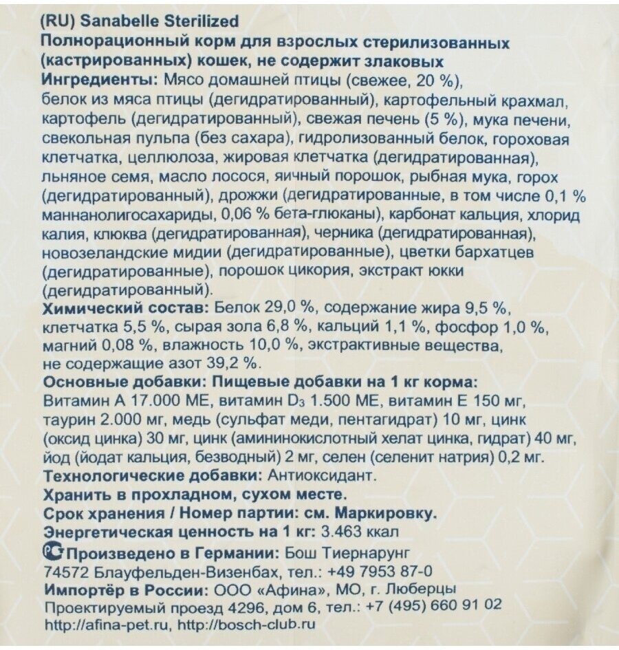 Особая формула Sanabelle STERILIZED с пониженной энергетической плотностью способствует поддержанию идеальной кондиции и препятствует развитию ожирения, которому часто подвержены кастрированные кошки. Высокое содержание пищевых волокон помогает контролировать чувство голода и уменьшает вероятность кошкой переедания. Кроме того, максимально богатый омега-3 ненасыщенными жирными кислотами состав эффективно борется с воспалительными процессами в нижних мочевыводящих путях и снижает риск развития мочекаменной болезни. В составе нового корма полностью отсутствуют злаковые, поэтому рацион Sanabelle STERILIZED может быть рекомендован даже для кошек с пищевой непереносимостью и аллергией на злаковые.
