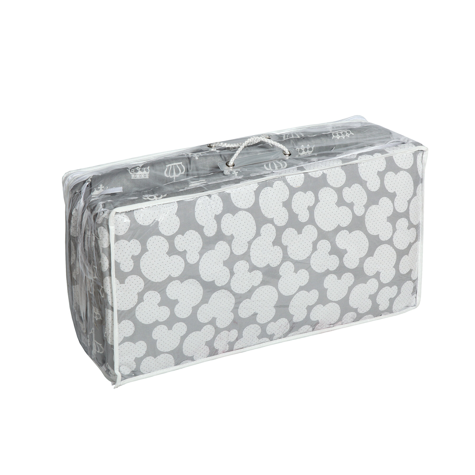 Бортик представлен в виде 4 двухсторонних подушек на завязочках, что позволяет использовать по всему периметру кроватки: 360 см. Каждая подушка идет в комплекте со съемной наволочкой на молнии.