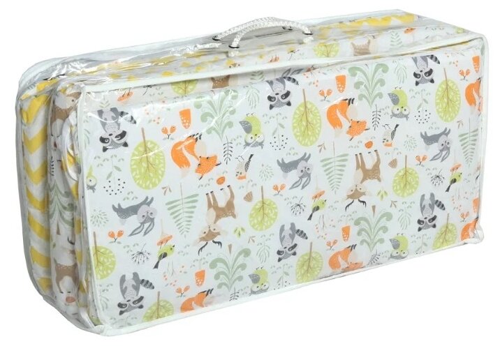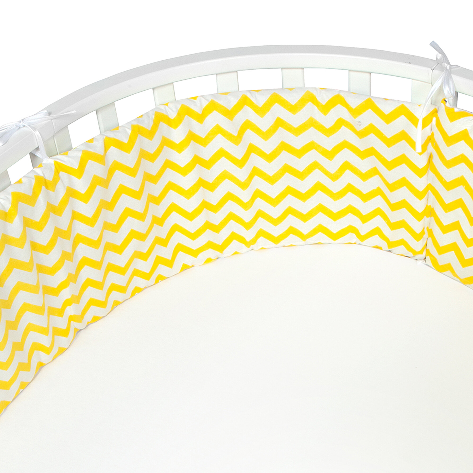 Бортик представлен в виде 4 двухсторонних подушек на завязочках, что позволяет использовать по всему периметру кроватки: 360 см. Каждая подушка идет в комплекте со съемной наволочкой на молнии.