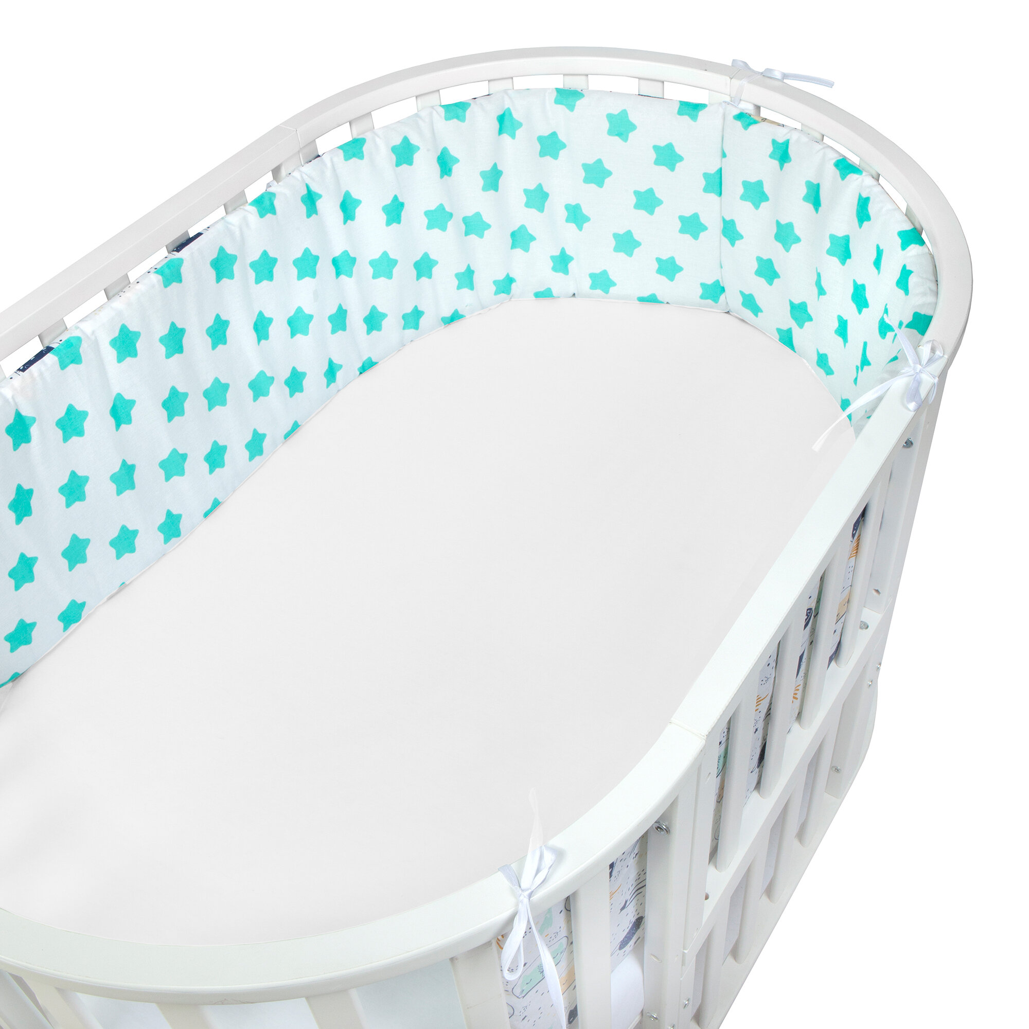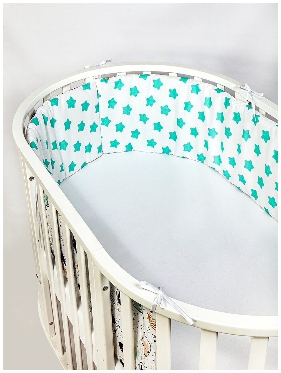 Бортик представлен в виде 4 двухсторонних подушек на завязочках, что позволяет использовать по всему периметру кроватки: 360 см. Каждая подушка идет в комплекте со съемной наволочкой на молнии.