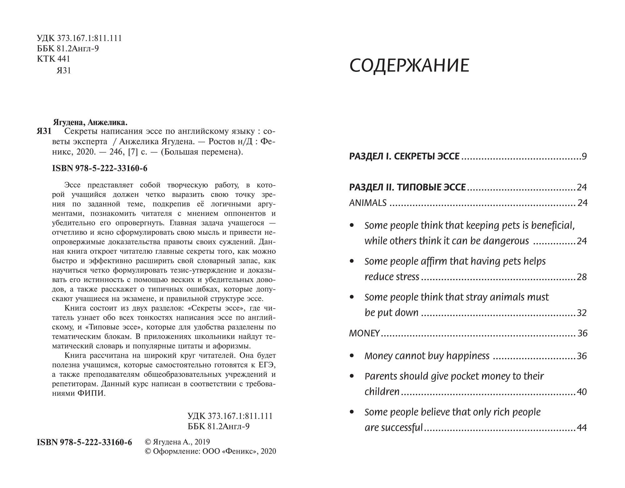 Книга состоит из двух разделов: "Секреты эссе", где читатель узнает обо всех тонкостях написания эссе по английскому, и "Типовые эссе", которые для удобства разделены по тематическим блокам. В приложениях школьники найдут тематический словарь и популярные цитаты и афоризмы.