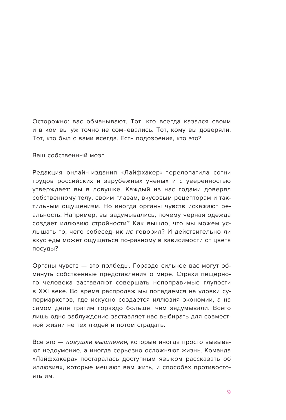 Эта книга - путеводитель по самым распространенным человеческим заблуждениям и способам их преодоления. Перед вами не скучная энциклопедия, а настоящий учебник жизни, который поможет лучше узнать самого себя, окружающих и мир вокруг. Эффективные методики, собранные командой популярного онлайн-издания Лайфхакер, позволят выйти из круга иллюзий и выбрать счастливую жизнь, а не слезы в подушку. Применяйте прочитанное на практике и больше никогда не давайте мозгу вас обмануть.