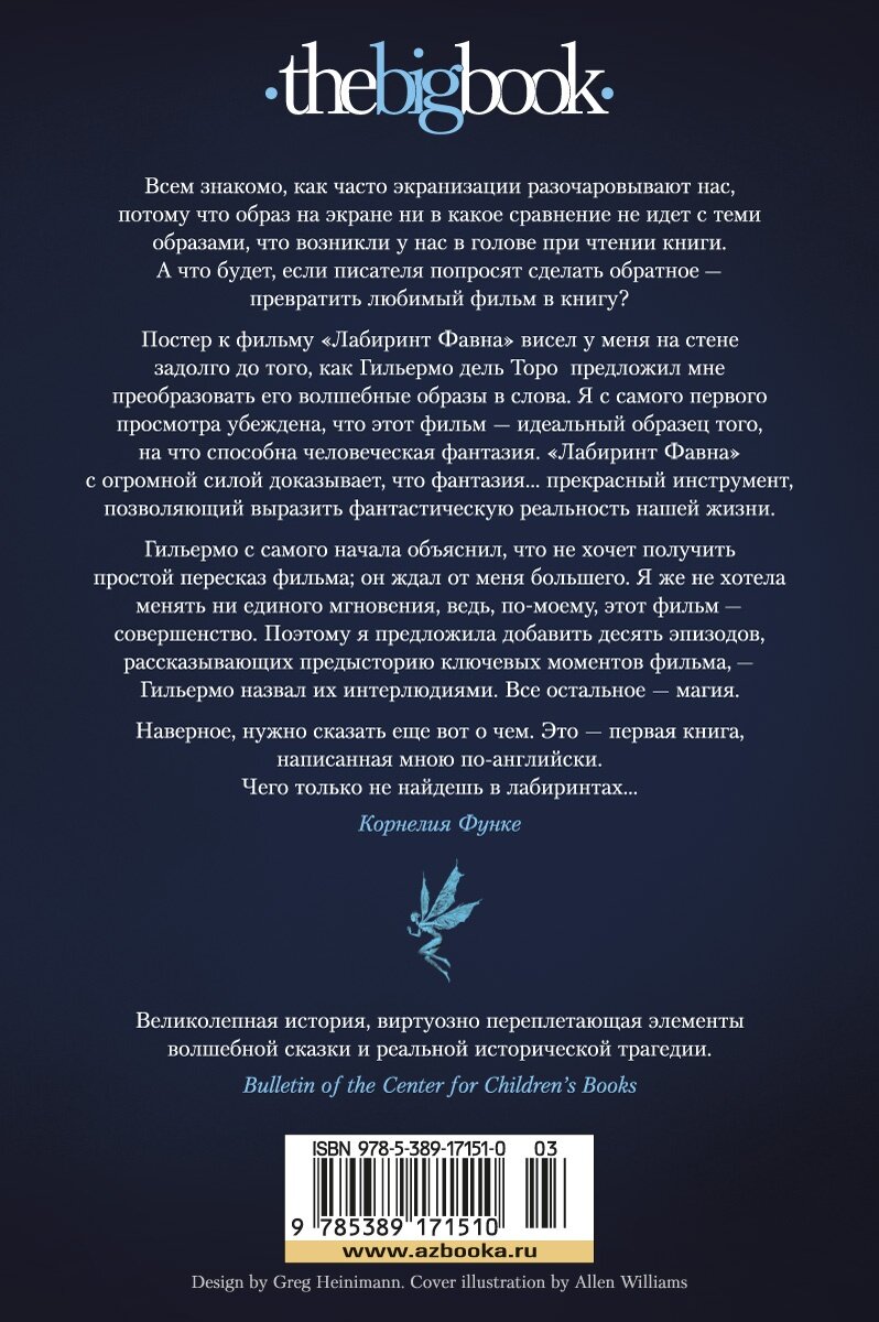Впервые на русском — уникальный продукт коллективного творчества: книга, написанная современным классиком Корнелией Функе по мотивам знаменитого фильма «оскаровского» лауреата Гильермо дель Торо «Лабиринт Фавна» и проиллюстрированная мастером сказочной иллюстрации Алленом Уильямсом. В этой фантазии поистине эпического размаха читатель встретит мифических трикстеров и кровожадных чудовищ, жестоких солдат и отважных мятежников, и потерянную принцессу, не теряющую надежды отыскать дорогу домой…