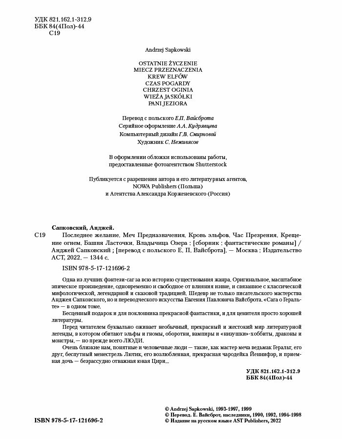 Последнее желание. Меч Предназначения. Кровь эльфов. Час Презрения. Крещение огнем. Башня Ласточки. Владычица ... (все романы о Ведьмаке в одном томе) (Анджей Сапковский); ИЗДАТЕЛЬСТВО "АСТ", 1993, 1997, 1999