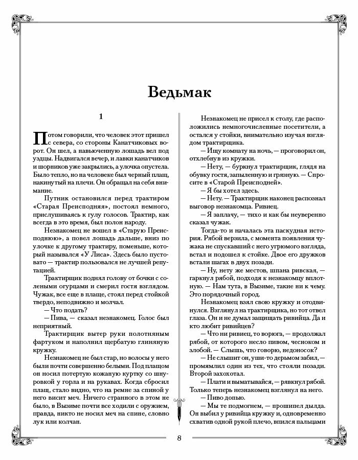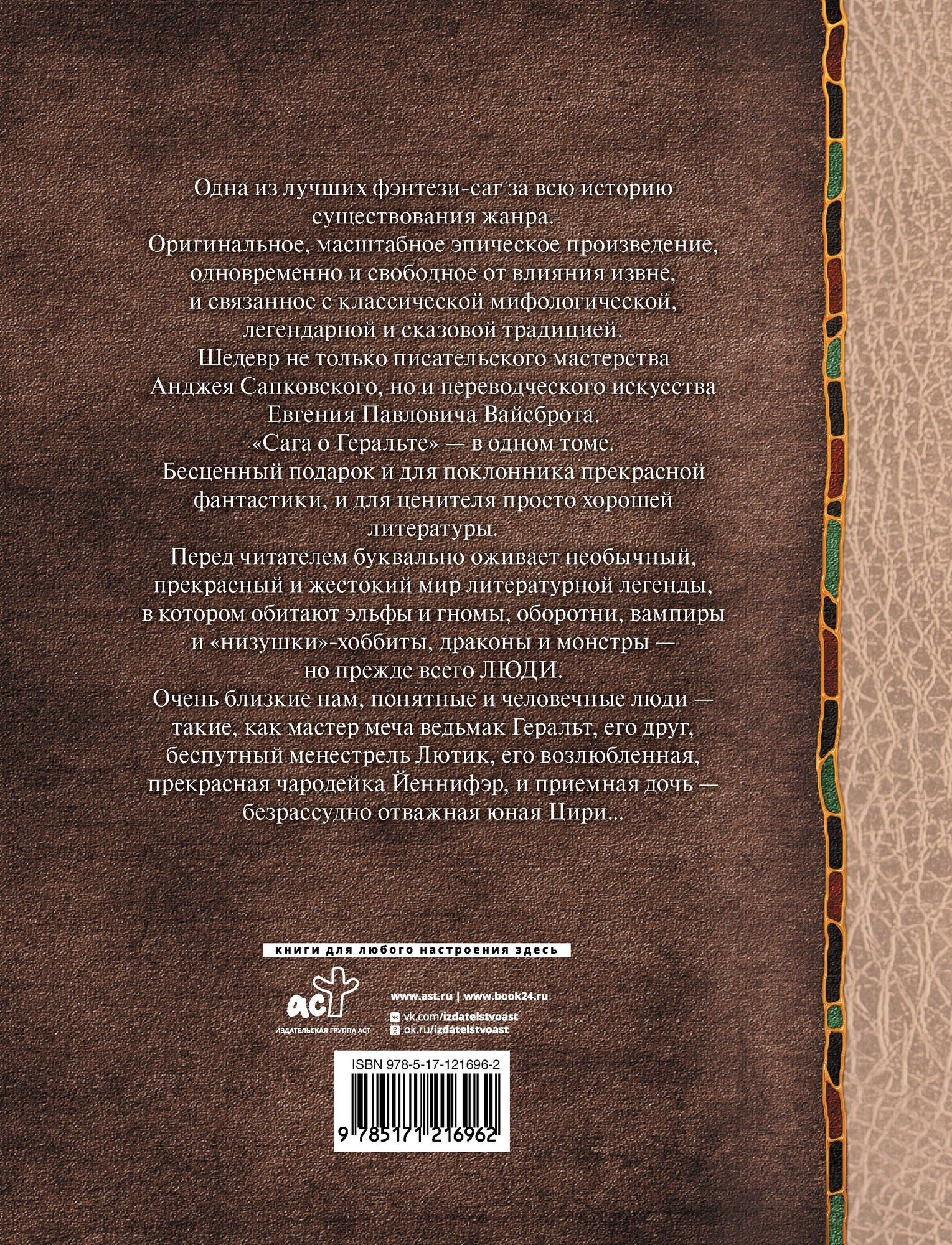 Одна из лучших фэнтези-саг за всю историю существования жанра. Оригинальное, масштабное эпическое произведение, одновременно и свободное от влияния извне, и связанное с классической мифологической, легендарной и сказовой традицией. Шедевр не только писательского мастерства Анджея Сапковского, но и переводческого искусства Евгения Павловича Вайсброта. "Сага о Геральте" — в одном томе. Бесценный подарок и для поклонника прекрасной фантастики, и для ценителя просто хорошей литературы. Перед читателем буквально оживает необычный, прекрасный и жестокий мир литературной легенды, в котором обитают эльфы и гномы, оборотни, вампиры и "низушки"-хоббиты, драконы и монстры, — но прежде всего ЛЮДИ. Очень близкие нам, понятные и человечные люди — такие как мастер меча ведьмак Геральт, его друг, беспутный менестрель Лютик, его возлюбленная, прекрасная чародейка Йеннифэр, и приемная дочь — безрассудно отважная юная Цири…