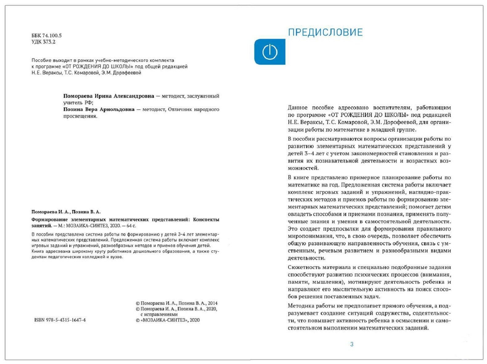Формирование элементарных математических представлений. 3-4 года. Конспекты занятий. (Позина Вера Арнольдовна, Помораева Ирина Александровна); МОЗАИКА kids, 2020