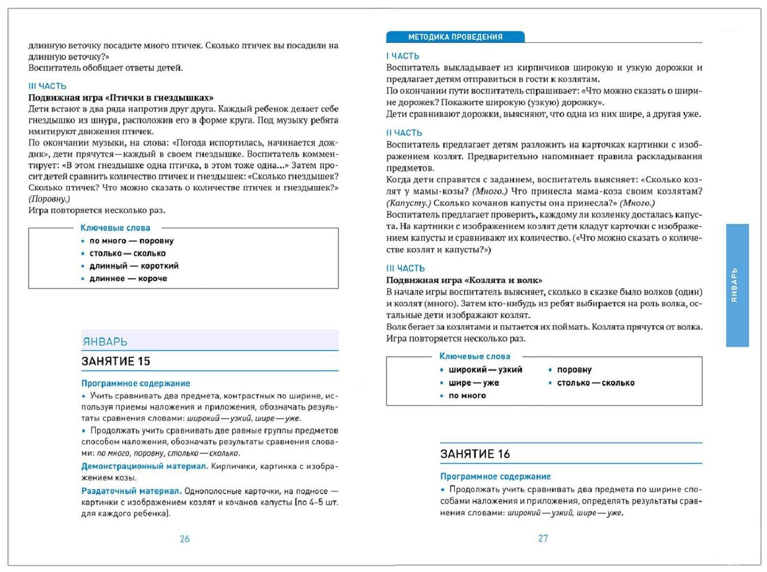 Системность методики отражена в примерном годовом планировании: для каждого месяца расписано, какие математические знания и умения приобретает ребенок. Например, умение различать фигуры, использовать слова большой – маленький; длинный – короткий; много, один, ни одного; классифицировать предметы; ориентироваться в пространстве и т. д.