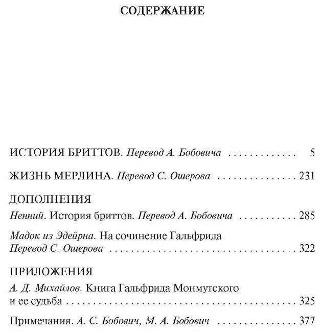 Помимо исторических хроник "История бриттов" и поэмы "Жизнь Мерлина" в данное издание вошли также "История бриттов" Неннина , "Мадок из Эдейрна. На сочинение Гальфрида", а также "Книга Гальфрида Монмутского и ее судьба" А.Д.Михайлова. Все исторические опусы приводятся в переводе с латыни, языка достаточно сложного в изложении. Поэма читается довольно хорошо, а вот сами хроники мучительно тяжело. Но ситуацию облегчает большое количество комментариев переводчиков.