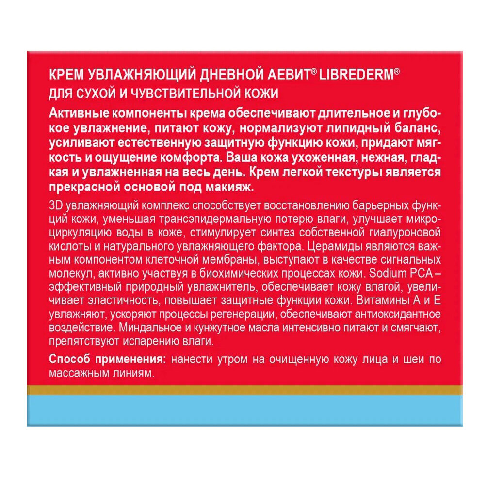 Описание товара:Librederm Aevit by Librederm Крем Дневной увлажняющий, 50 мл. Для сухой и чувствительной кожи. Крем легкой текстуры обеспечивает длительное и глубокое увлажнение, питает кожу, нормализует липидный баланс, усиливает естественную защитную функцию кожи, придает мягкость и ощущение комфорта. Ваша кожа ухоженная, нежная, гладкая и увлажненная на весь день. Не содержит искусственных отдушек и красителей. Является прекрасной основой под макияж. ГОСТ 31460-2012.Состав товара:Aqua, ethylhexyl stearate, glycerin, isostearyl isostearate, caprylic/capric triglyceride, sodium acrylates copolymer, cyclopentasiloxane, cetyl alcohol, xylitylglucoside, sesamum indicum oil, prunus.Меры предосторожности:Хранить в недоступном для детей месте. По истечении срока годности средство не применять.Способ применения:Нанесите крем на очищенную кожу лица и шеи по массажным линиям.