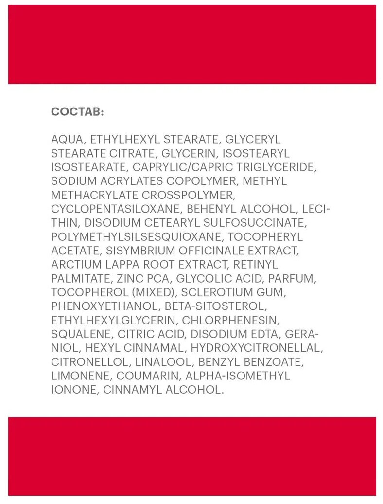 - Балансирующий комплекс нового поколения, включающий в себя экстракты репейника, гулявника, -гидроксикислоты и соль цинка, полученную в ходе реакции с аминокислотой, оказывает антисептическое, себорегулирующее, матирующее и очищающее действия;