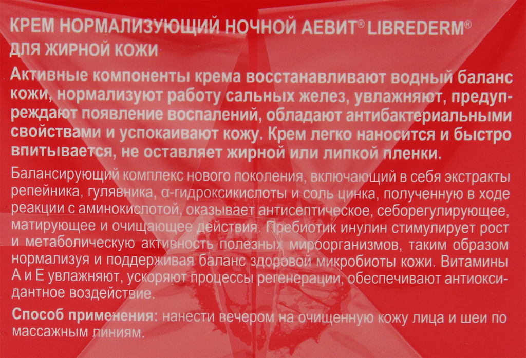 На сегодняшний день товар «Либридерм аевит крем ночной нормализующий банка 50мл Дина+ ООО/ООО БИОФАРМЛАБ/ООО ИНТРОМАТИКА (1116459)» можно купить с кешбеком в 1 магазине: Яндекс.Маркет