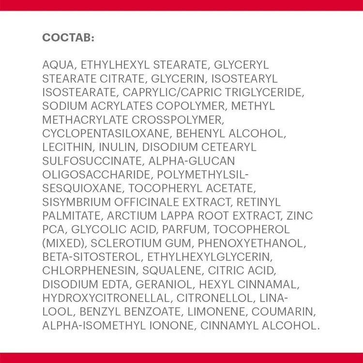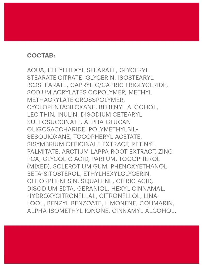 | Состав | aqua, ethylhexyl stearate, glyceryl stearate citrate, glycerin, isostearyl isostearate, caprylic/capric triglyceride, sodium acrylates copolymer, methyl methacrylate crosspolymer, cyclopentasiloxane, behenyl alcohol, lecithin, inulin, disodium cetearyl sulfosuccinate, alpha-glucan oligosaccharide, polymethylsilsesquioxane, tocopheryl acetate, sisymbrium officinale extract, retinyl palmitate, arctium lappa root extract, zinc pca, glycolic acid, parfum, tocopherol (mixed), sclerotium gum, phenoxyethanol, beta-sitosterol, ethylhexylglycerin, chlorphenesin, squalene, citric acid, disodium edta, geraniol, hexyl cinnamal, hydroxycitronellal, citronellol, linalool, benzyl benzoate, limonene, coumarin, alpha-isomethyl ionone, cinnamyl alcohol |