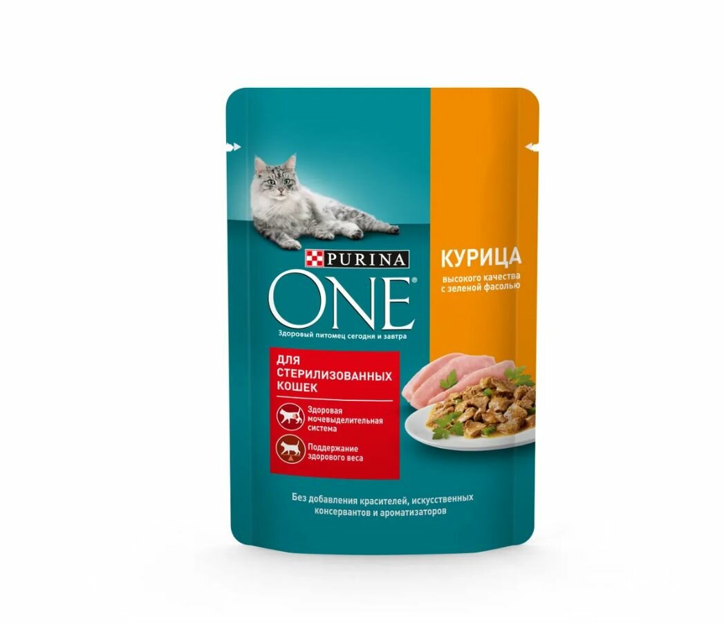 Описание товара:Корм консервированный полнорационный сбалансированный Purina One (Пурина Уан) специально разработан ветеринарными врачами и диетологами Нестле Пурина ПетКэр. Корм Purina One (Пурина Уан) — это сочетание отличного вкуса и гарантия пользы. Вы можете быть уверены, что с кормом Purina One Ваша кошка получит питание высокого качества с отличным вкусом для поддержания ее здоровья.Состав товара:Мясо и мясные ингредиенты (включая курицу), экстракты растительного белка, рыба и продукты ее переработки, продукты переработки растительного сырья, аминокислоты, минеральные вещества, масла и жиры, овощи (зеленая фасоль), загустители, сахара, витамины.Способ приготовления:Для взрослой кошки среднего веса (4 кг) требуется 3-4 пакетика в день. Кормление желательно разделить Минимум на два приема. Рекомендуемая суточная норма зависит от погодных условий, уровня активности кошки и ее физических особенностей. Подавайте корм комнатной температуры. Следите, чтобы у вашей кошки всегда была чистая свежая питьевая вода.Меры предосторожности:Упаковка не предназначена для игры. Для предотвращения риска удушения храните в недоступном для детей и животных месте. Хранить в сухом прохладном месте. После вскрытия хранить в холодильнике максимум 24 часа.
