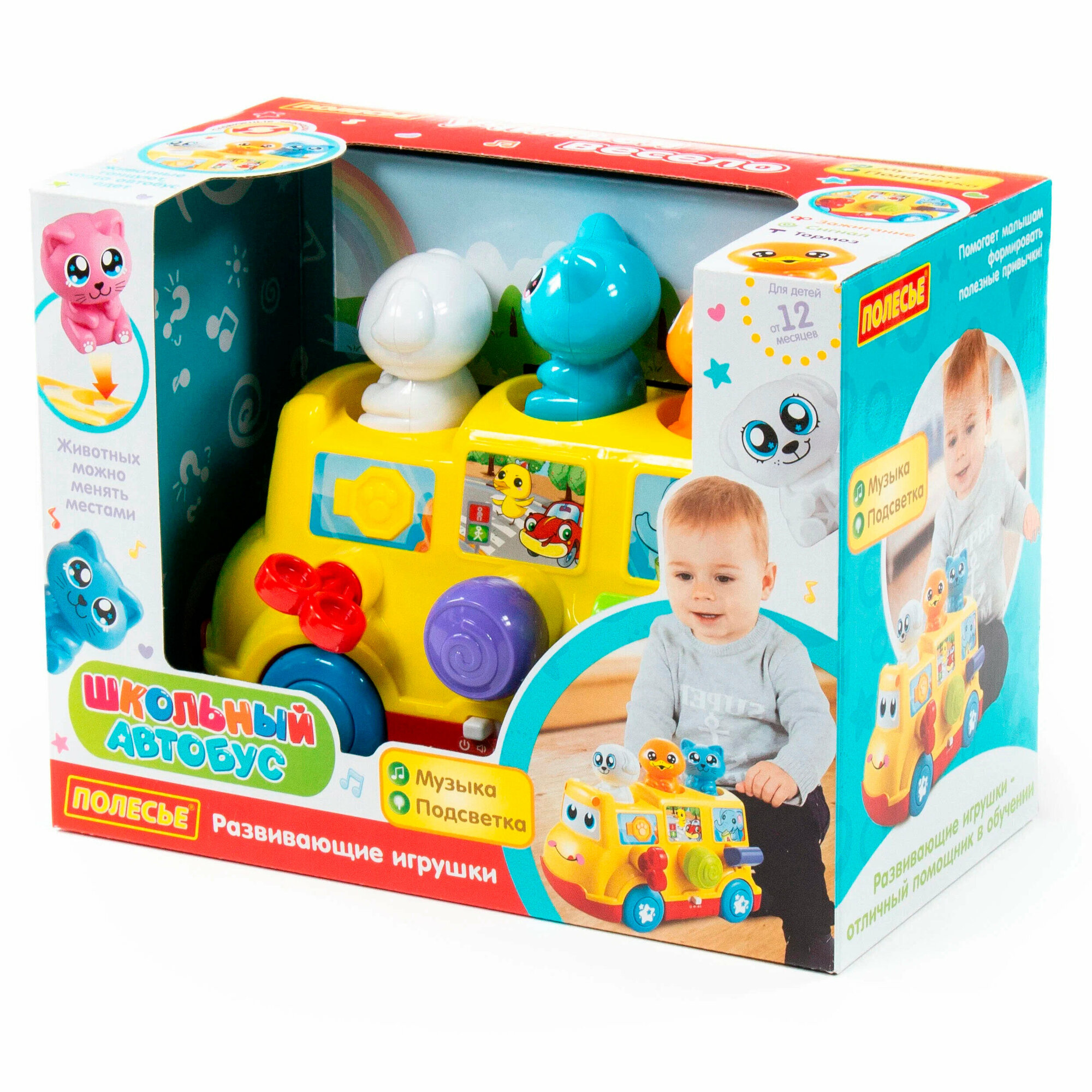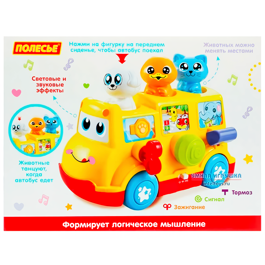 Когда игрушка движется, животные танцуют. Если перед автобусом возникнет препятствие, он самостоятельно развернётся и поедет в другую сторону.