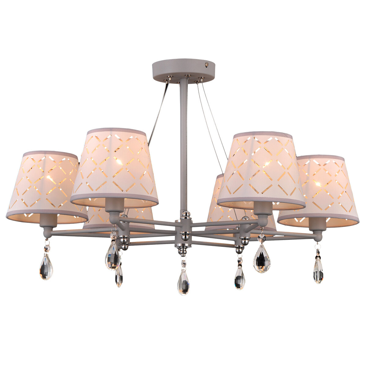 Люстра Lisbon с гранеными хрустальными подвесками станет эффектной деталью обстановки гостиной, кабинета или спальной комнаты. Абажуры, декорированные красивым ажурным орнаментом, выполнены из текстиля. Плотная белая ткань рассеивает и смягчает свет, делая его неутомительным для глаз. Детали арматуры изготовлены из прочного металла со светло-серым антикоррозийным покрытием. Модель от Natali Kovaltseva гармонично дополнит интерьеры: прованс, модерн, классический, арт-деко.