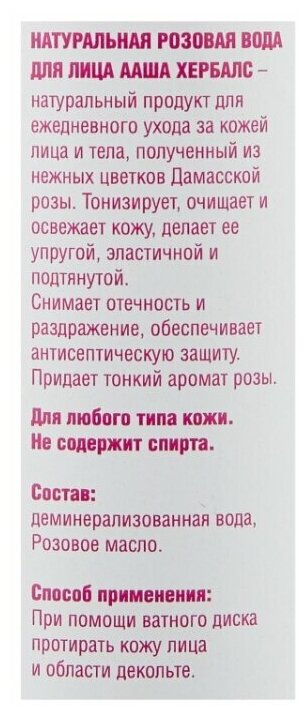 | Состав | розовая вода, сок листьев алое вера, водный настой календулы, вода, пропиленгликоль, полисорбат-20, отдушка, содиумметилпарабен, дисодиум эдта |
