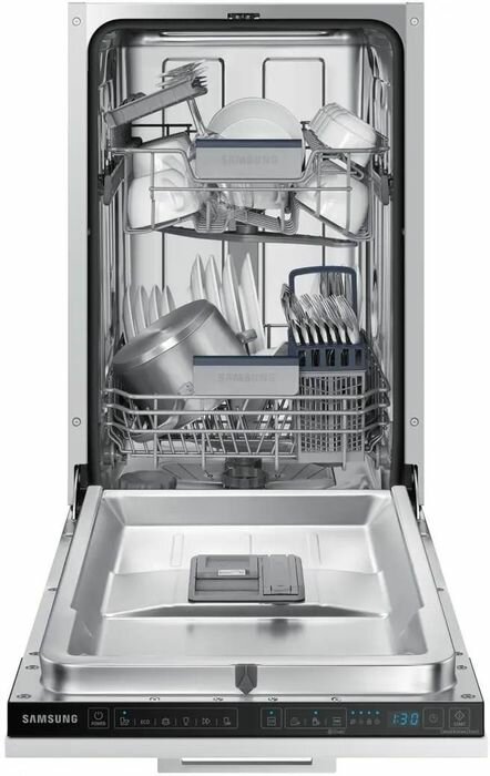 Встраиваемая посудомоечная машина Samsung за 1 цикл расходует 9,5 л воды. Максимальная вместимость за 1 загрузку составляет 9 наборов. Сенсорная панель управления находится внутри, сверху на дверце.