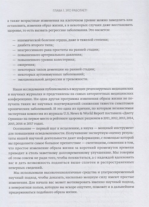 Мы очень рады, что наши исследования и работы других ученых подтверждают: большую часть распространенных и тяжелых хронических заболеваний, а также возрастные изменения на клеточном уровне, можно замедлить или остановить, изменив образ жизни, а в некоторых случаях даже восстановить здоровье, то есть вызвать регрессию заболевания. Это касается: