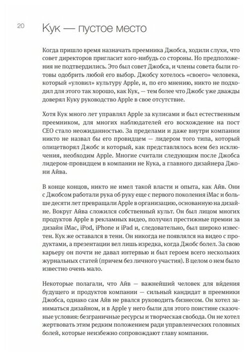 История скромного гения, который после смерти Стива Джобса привел Apple к головокружительным высотам.Смерть Стива Джобса в 2011 году нанесла зияющую рану одной из самых инновационных компаний в истории. Джобс был не просто легендарным основателем Apple и CEO компании - он был живым воплощением глобального мегабренда. Трудно было представить, что кто-то сможет занять его место, и уж тем более скромный и незаметный Тим Кук, которого многие считали " рабочей лошадкой" Apple. В условиях нарастающей конкуренции со стороны Android и неопределенности в отношении будущих продуктов компании многие предрекали Apple скорую катастрофу.Но прошло восемь лет - и дела в Apple идут превосходно. После смерти Джобса компания достигла высшей точки: она стала самой дорогой корпорацией на планете, первой в истории, чья стоимость составила триллион долларов. Цена акций Apple выросла почти в три раза.Под твердым руководством Тима Кука Apple вплотную занялась вопросами возобновляемой энергии, организацией цепочек сбыта, справедливых в плане труда и не наносящих вреда экологии, обеспечением конфиденциальности пользователей и созданием продуктов, легко поддающихся переработке. Тим Кук уверенно ведет компанию в новую эру процветания.Пользуясь доступом к нескольким инсайдерам Apple, Кани рассказывает вдохновляющую историю человека, который рискнул заменить незаменимого. Благодаря уверенному и чуткому руководству, созданию инновационной системы производства и сбыта, а также преданности собственным ценностям он достиг больше, чем кто-либо мог вообразить.Для всех, кто интересуется компанией Apple и ее историей.