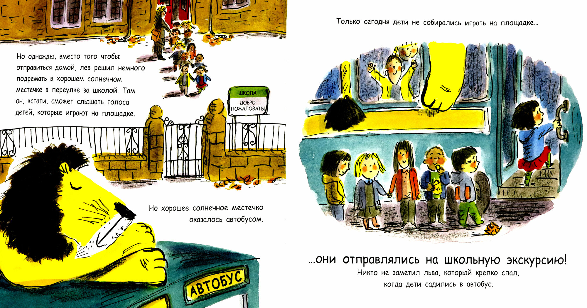 Обиженный лев, поджидая Ирис вздремнул на крыше школьного автобуса и приехал вместе с классом в музей.