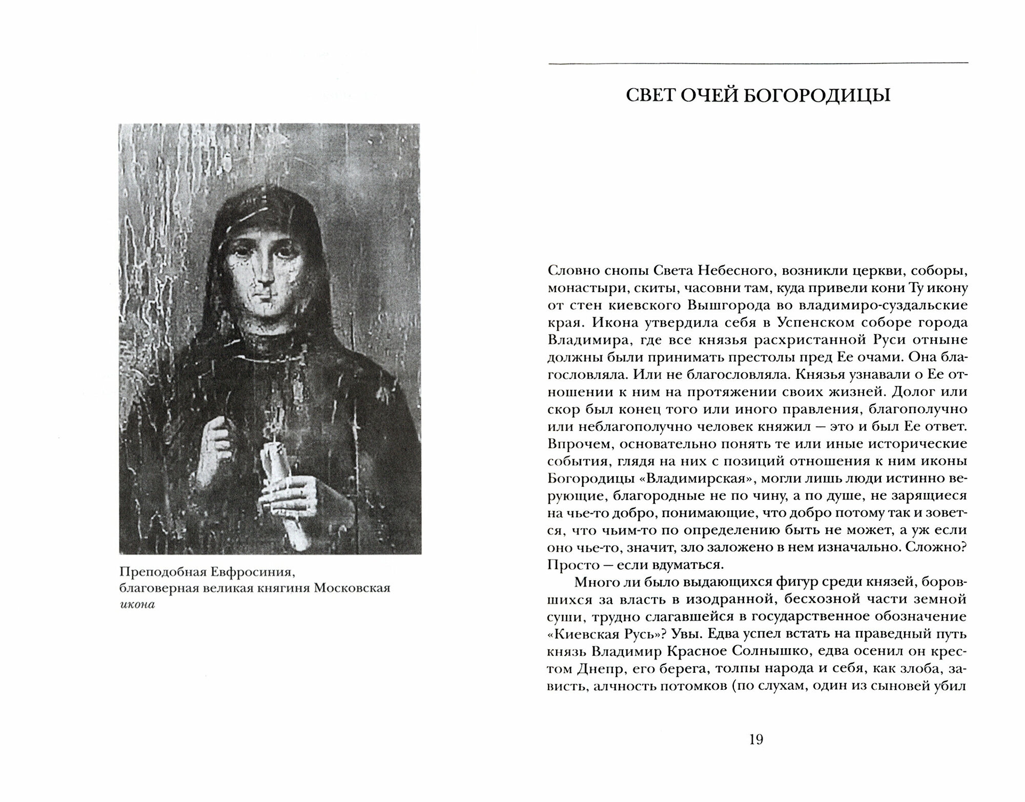 Евдокия Московская - история жизни и Жития счастливой женщины, великой княгини, принявшей монашеский постриг с именем Евфросинии. Она была женой великого князя Дмитрия Донского и первой активно действующей кремлевской хозяйкой. Книга содержит в себе факты, документы, события, сказания, легенды, слухи и взгляд автора. В книге - чудо рождения Евдокии, ее детство и юность; светлый союз с Дмитрием Донским; ее вклад в жизнь Руси во время княжения великого князя и после его смерти; наследие, которое осталось нашей сегодняшней жизни от нее. В XIV веке девочка Евдокия словом обозначила простую правду жизни: спасение нередко приходит через страдание и поругание. Душа часто бедой спасается, но гибнет душа в кажущемся благополучии, ибо оно - чаще всего - беда.