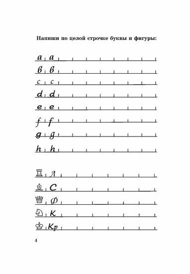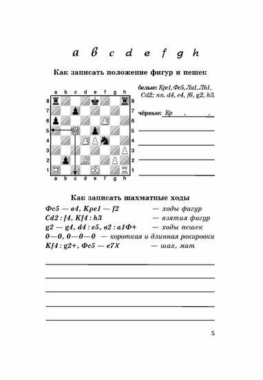 Вначале блокнот очень похож на прописи. На первых страницах ребенок научится записывать новые шахматные буквы и фигуры. Далее следуют страницы для записи партий. Кроме того в этом блокноте ребенок найдет: страницы для записи решения задач; страницы для записи уроков и выполнения домашних заданий; турнирную таблицу и карточку участника; шахматные правила и выдержки из правил шахмат ФИДЕ; сведения о всех чемпионах мира.