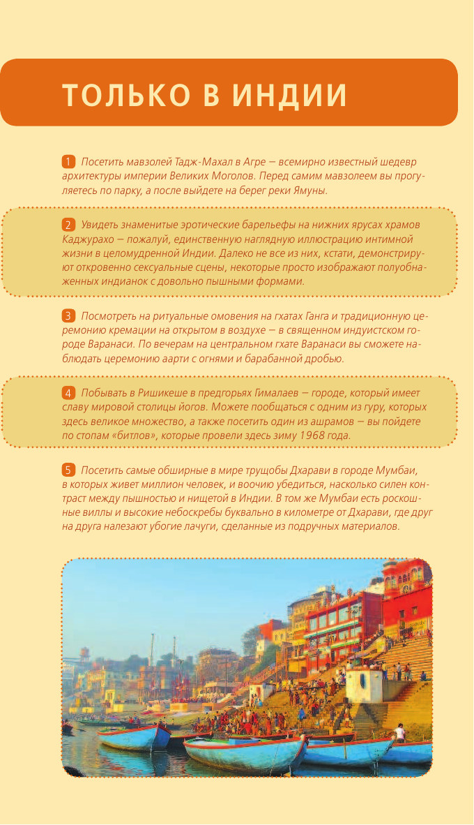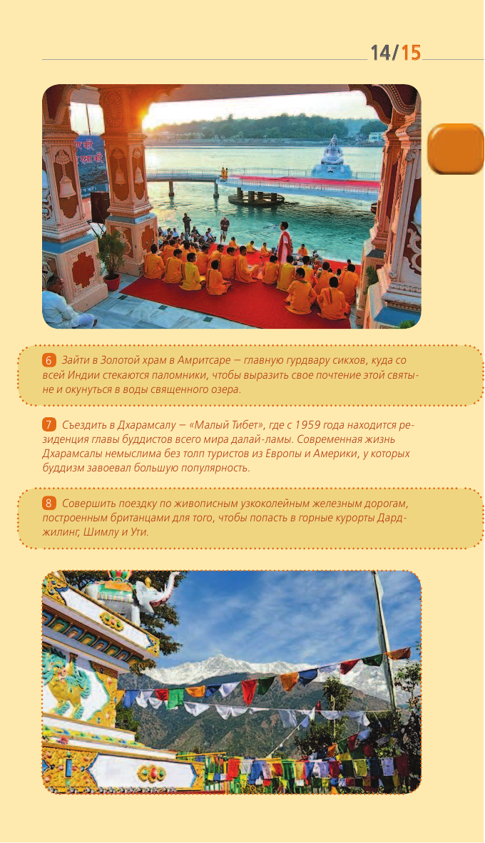 Индия - загадочная страна, которая веками привлекала сотни путешественников и искателей своего духовного пути. Серия "Оранжевый гид" представляет для вас уникальный путеводитель, с которым вы сможете исследовать эту страну совершенно по-новому. Вы познакомитесь с культурой древнейшей цивилизации, со страной, в которой загадочным образом переплетаются ислам и индуизм, подвиг Махатмы Ганди и вековые традиции каст. Мегаполисы, ашрамы, горные города в Гималаях, священные деревни - увидеть все грани многоликой Индии, составить подробный план путешествия, успеть все и не забыть ничего вам поможет оранжевый гид по Индии.