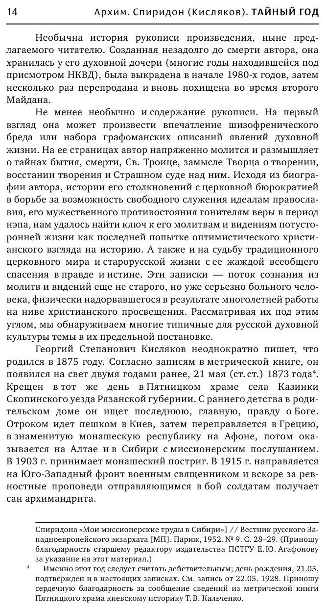 После почти столетнего забвения на родине личности и творчества архимандрита Спиридона (Кислякова) выходит полное издание его дневников. История рукописи произведения, предлагаемого читателю, загадочна, необычна и драматична. Созданная незадолго до смерти автора, она хранилась у его духовной дочери (многие годы находившейся под пристальным присмотром НКВД), была выкрадена в начале 1980-х годов, затем несколько раз перепродана и вновь похищена во время второго Майдана. К издателям рукопись попала от киевского обладателя, выкупившего и сохранившего дневники и воспоминания отца Спиридона. Само произведение представляет собой нерасшифрованное послание, к которому еще предстоит найти ключи, и исследовательская работа в этом направлении только-только начинается. Это не обычные дневниковые записи фиксирующего события и мысли человека, а описание одного года жизни, в каждый день которого вписаны тайные и явные смыслы, ведущие в вечность.