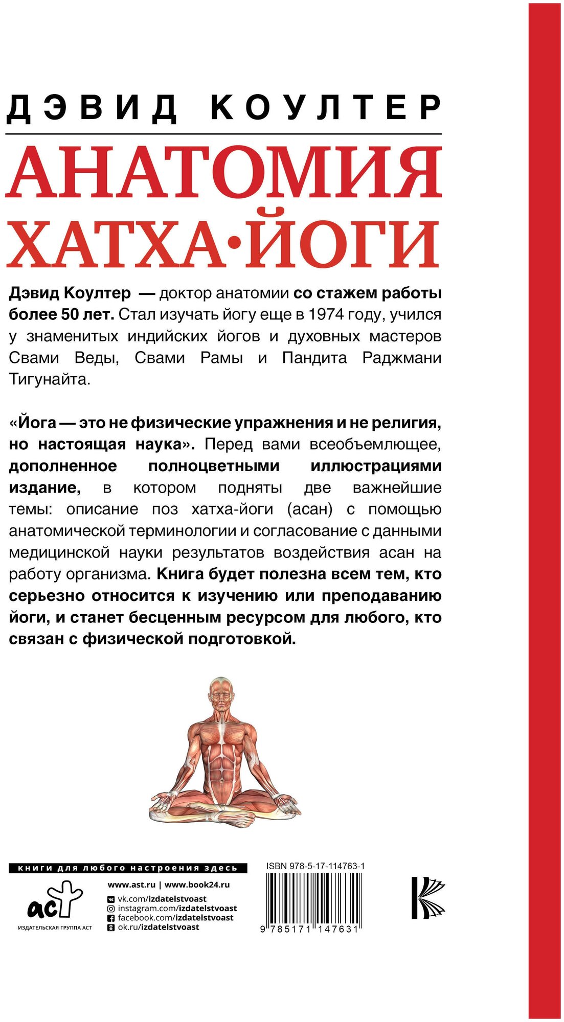"Йога - это не физические упражнения и не религия, но настоящая наука". Перед вами всеобъемлющее, дополненное полноцветными иллюстрациями издание, в котором подняты две важнейшие темы: описание поз хатха-йоги (асан) с помощью анатомической терминологии и согласование с данными медицинской науки результатов воздействия асан на работу организма. Книга будет полезна всем тем, кто серьезно относится к изучению или преподаванию йоги, и станет бесценным ресурсом для любого, кто связан с физической подготовкой.