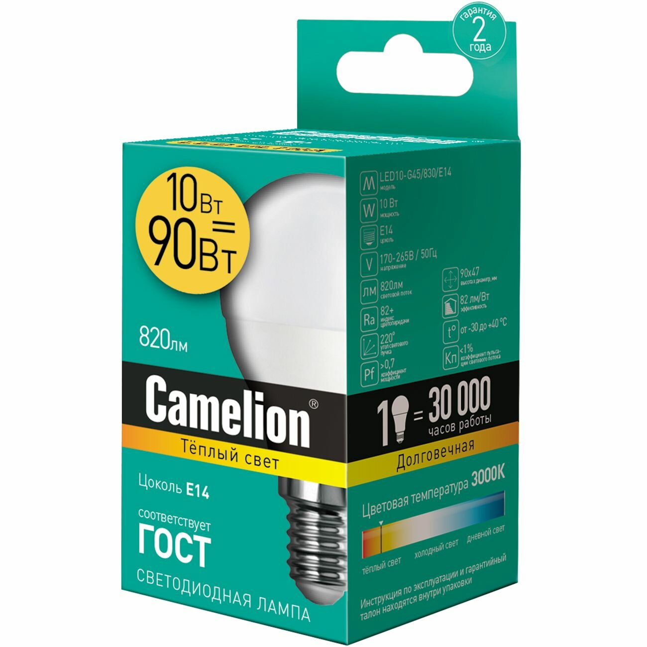 - Цветовая температура: 3000К - теплый белый;