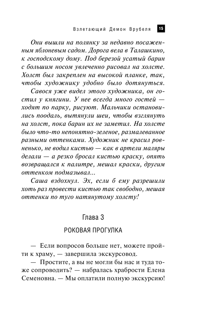 Художник Врубель всей душой любил поместье Талашкино, где он частенько гостил у меценатки княгини Марии Тенишевой. Именно там он написал свою картину "Взлетающий Демон" и именно там картина была утрачена на долгие годы... Привезшая на экскурсию в Талашкино своих студентов Елена Шварц случайно обнаруживает труп молодого мужчины, во рту у которого газетный лист, свернутый в виде папиросы. Вскоре выясняется, что убитый - реставратор, приехавший восстанавливать храм. Его дедом был известный советский художник Александр Тиунов - выпускник талашкинской школы, открытой для крестьянских детей хозяйкой усадьбы...