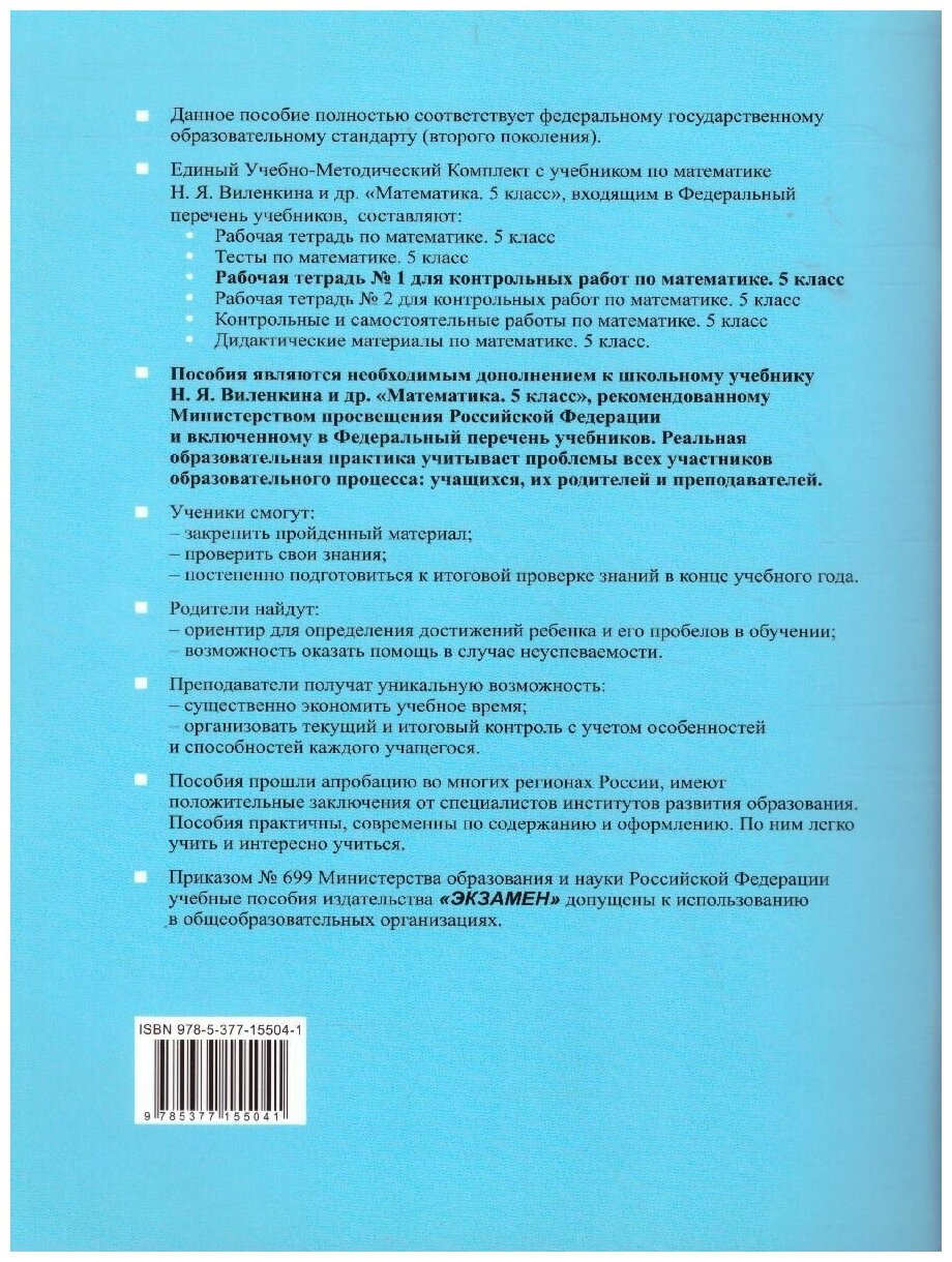 Математика 5 кл. Р/т №1 для контрольных работ (к уч. Виленкина и др.) (9 изд) (мУМК) Рудницкая (ФГОС) (Виктория Наумовна Рудницкая); Экзамен, 2020