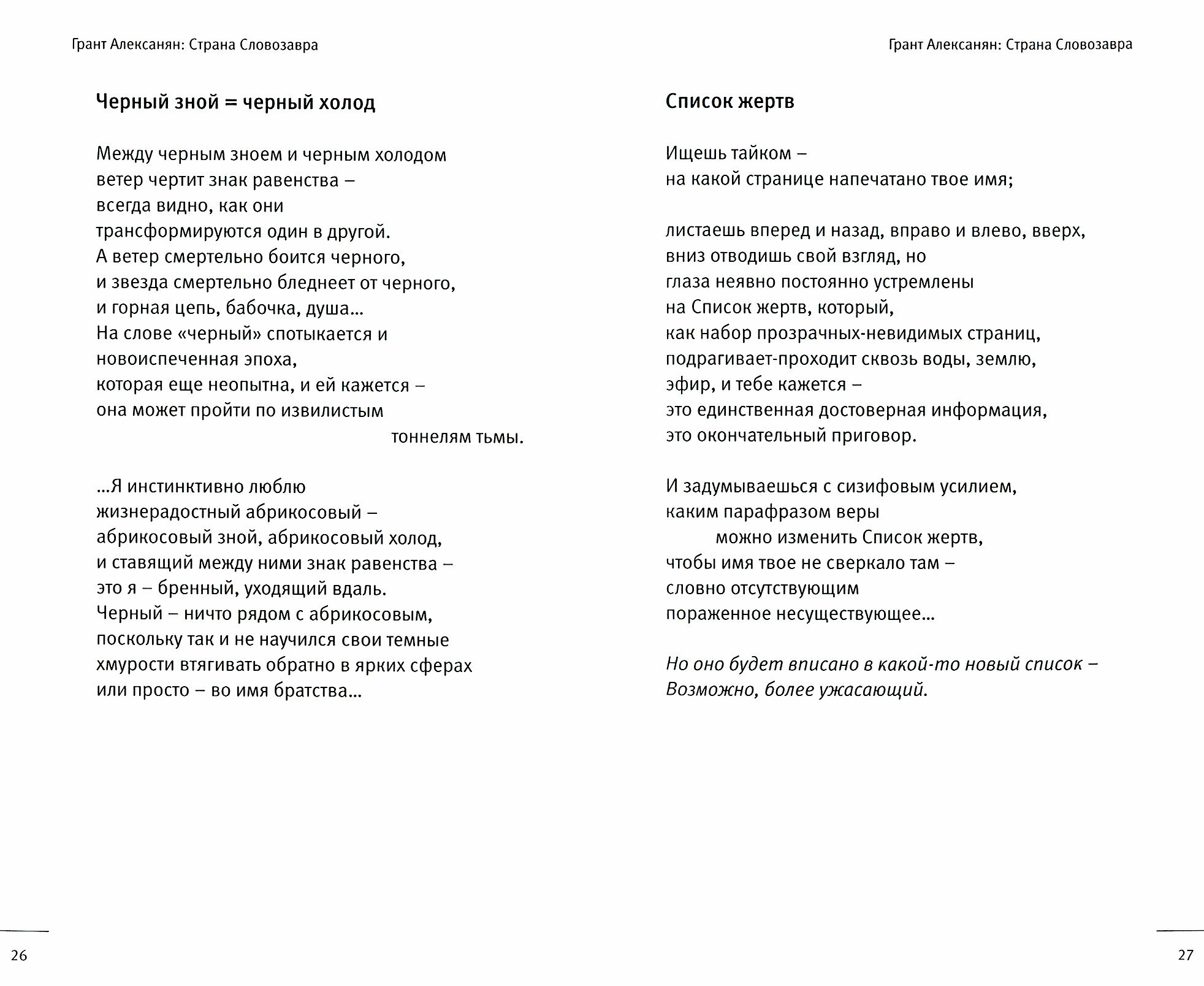 В книге представлены избранные стихотворения одного из ярких представителей современной армянской поэзии Гранта Алексаняна в русских переводах. Посредством излюбленного им верлибра поэт, будто сочетая графические линии, цветной рисунок и коллаж, соло и хоралы, свето-копирует внутренний образ Армении и мира, вращающихся времени и действующего человека, придавая их новый облик и чутье.