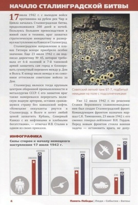 Уникальная книжная коллекция "Память Победы. Люди, события, битвы", приуроченная к 75-летию Победы в Великой Отечественной войне, адресована молодому поколению и всем интересующимся славным прошлым нашей страны. Выпуски серии рассказывают о знаменитых полководцах, крупнейших сражениях и различных фактах и явлениях Великой Отечественной войны. В доступной и занимательной форме рассказывается о сложнейшем и героическом периоде в истории нашей страны. Уникальные фотографии, рисунки и инфографика прекрасно дополняют текст и улучшают его восприятие.