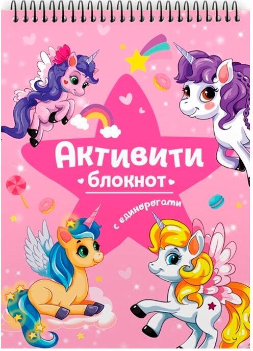 Активити-блокнот с милыми единорогами, которых так любят девочки. Даже пружинка у блокнота розовая. Много единорогов, принцесс, украшений и сладостей. Читательнице предлагается поискать единорогов, найти нужную дорогу, посчитать сладости, нарисовать недостающие предметы, найти отличия между картинками и, естественно раскрасить картинки. Есть ещё много других увлекательных заданий. В конце книги можно найти ответы.
